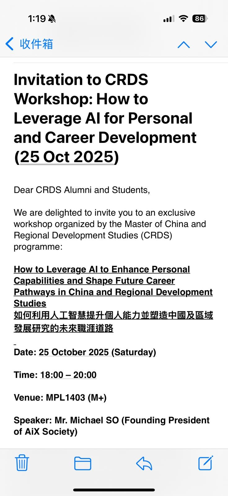 Join our exclusive workshop to discover how AI can enhance your personal capabilities and shape your career pathways, specifically for China and Regional Development Studies. Date: 25 Oct 2025. Speaker: Mr. Michael SO, Founding President of AiX Society. Venue: MPL1403 (M+). Free registration. In English & Chinese.